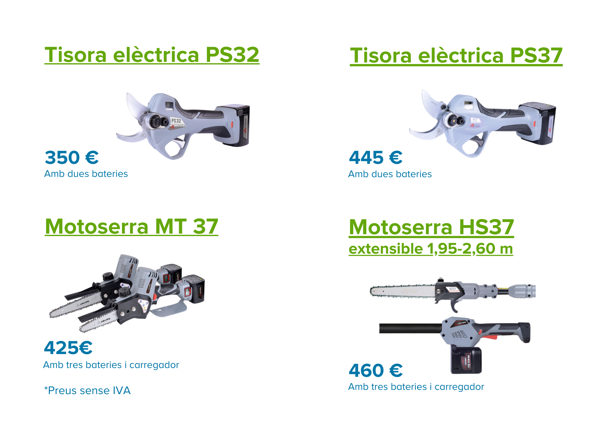 - Tijeras de podar eléctricas ARVIPO PS32 y PS37: Las tijeras PS32 y PS37 son ideales para la poda de precisión. Con una gran capacidad de corte y una autonomía de batería de larga duración, son perfectas para trabajar en viñedos, olivos y otras plantaciones. El modelo PS37 destaca por su mayor potencia, capaz de cortar ramas más gruesas, mientras que la PS32 es una opción más ligera y manejable.