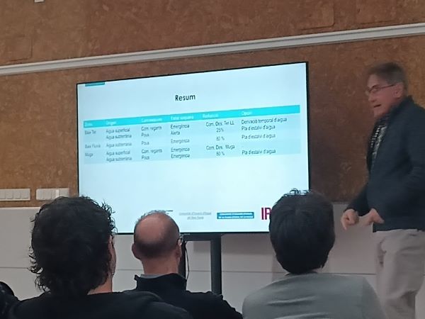 Francisco Camps, del programa Cultivos Extensivos Sostenibles del IRTA, destacó la gravedad de la situación, señalando que ya se han acumulado 42 meses consecutivos con lluvia por debajo de la media histórica. El déficit de lluvia entre 2020 y 2023 ha sido particularmente alarmante en la cuenca de la Muga, con una reducción de 862L/m2. El Plan de Sequía se ha puesto en marcha para gestionar esta crisis, imponiendo restricciones basadas en las fases y supervisando la disponibilidad de agua para las comunidades de regantes. En el Ter se hizo una reducción de los caudales circulantes de los ríos, que pueden afectar al relleno de los acuíferos. Los acuíferos de la cuenca del Ter se miden con dos piezómetros, uno para el acuífero superficial y uno para el acuífero profundo. Con los datos que nos dan, nos indican que el acuífero superficial está dentro de la normalidad. El acuífero profundo sí está significativamente más bajo.