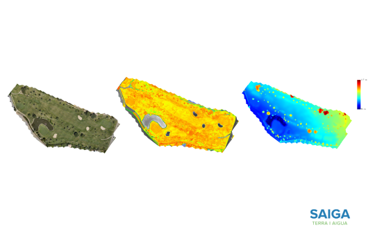 Per altra banda, i més recentment, hem fet un anàlisi multiespectral de l'estat de la Gespa del Golf de Peralada. Aquest es desenvolupa recopilant una sèrie de captures d'imatges amb el dron a molt alta resolució, 2,3 cm/px, que es processen posteriorment seguint diferents índexs. D'aquesta manera obtenim un informe detallat de l'estat de la gespa i detectem si hi ha alguna problemàtica com el dèficit hídric o alguna petita zona infectada de fongs. Amb aquesta informació es poden identificar i resoldre de forma més precisa les afectacions que hi puguin haver per prendre mesures i intervenir, més de pressa, si és necessari.